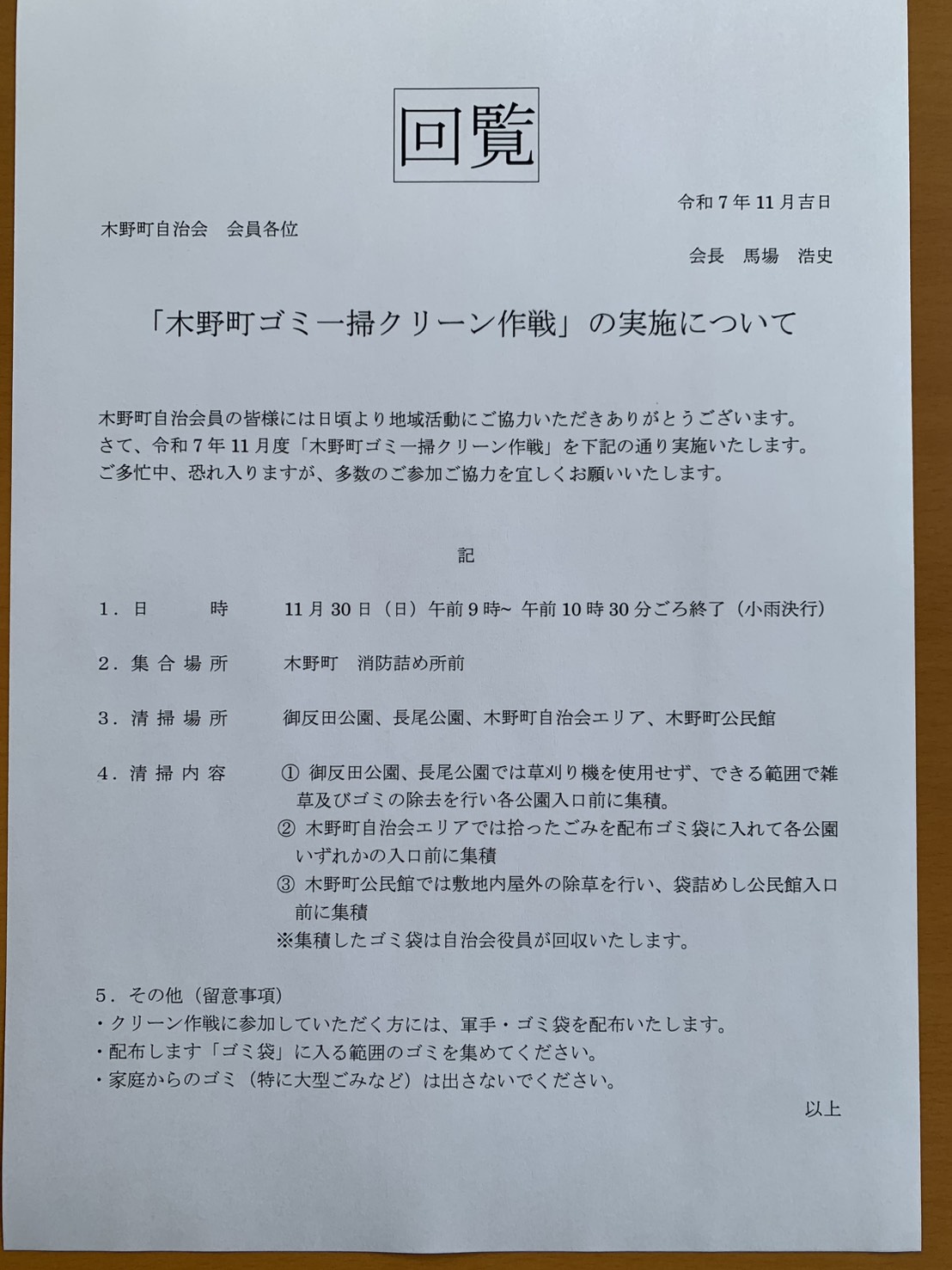 【回覧】「木野町ゴミ一掃クリーン作戦実施」のお知らせ 投稿者: kinocho2025年11月9日2025年11月9日きののまち、木野町自治会 立冬の候、朝夕の冷え込みが一段と増してまいりましたが、みなさまはいかがお過ごしでしょうか? 今年最後の町内清掃「木野町一掃クリーン作戦」を11月30日(日)に開催いたします。新年を迎えるにあたり、みんなで町をきれいにしませんか??多くの方のご参加をよろしくお願いいたします。 いいね:いいね 読み込み中…