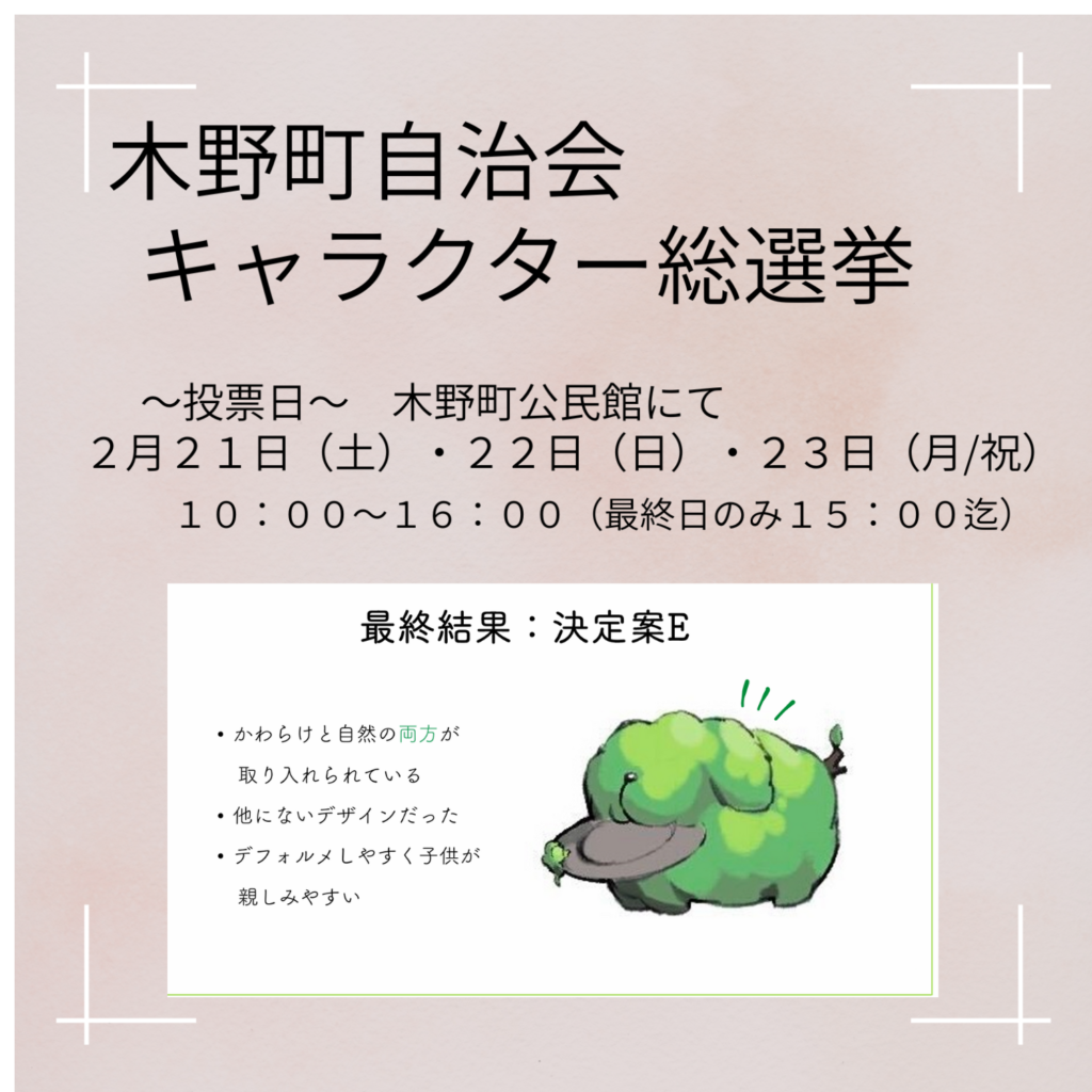 キャラクター総選挙④~ききまる~ 投稿者: kinocho2026年1月26日2026年1月23日きののまち、木野町自治会 本日紹介するキャラクターは、エントリーNO.4「ききまる」 キャラクター総選挙会場(木野町公民館)では、この「ききまる」のプロフィールや「ききまる」のグッズ展開も紹介されています。2025年京都精華大学マンガ学部キャラクターデザインコース1年生が制作したキャラクターを是非見に来て投票してくださいね。 ※キャラクターを紹介する順番は自治会独自の方法で決めさせていただいております。※エントリーナンバーは選挙会場で展示するキャラクターの順番とは異なります。 いいね:いいね 読み込み中…