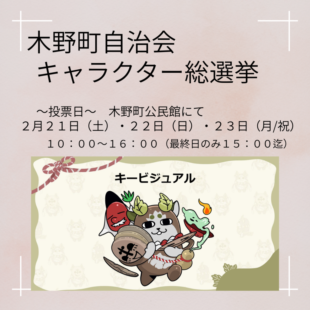 キャラクター選挙会場では、この「きののすけ」のプロフィールや「きののすけ」たちを使った木野町自治会の年間スケジュールまでもが考えられた展示物が用意されています。