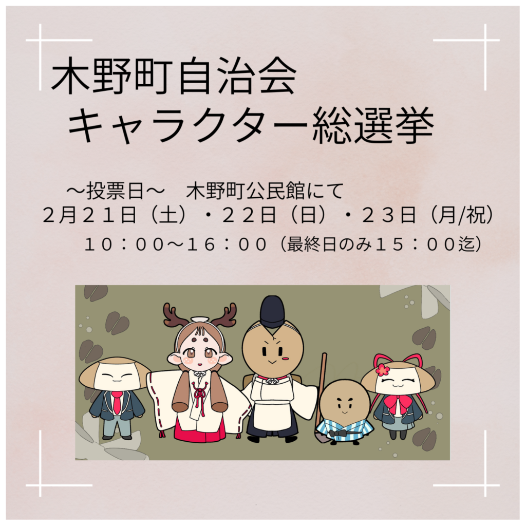 キャラクター総選挙会場では、この5体「かのこ姫」「きのまろ」「きのまつ」「きのは」「きのや」のプロフィールやこれらのキャラクター活用方法まで紹介されています。