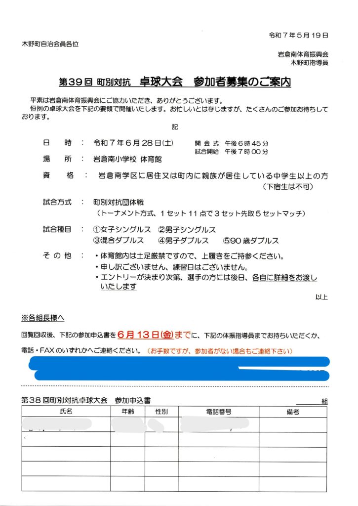 【回覧】参加者募集 投稿者: kinocho2025年5月20日2025年5月18日きののまち、木野町自治会 おはようございます。日頃から自治会活動にご理解・ご協力いただき誠にありがとうございます。 6月には2つの町別対抗◯◯大会が開催されます。参加者募集しておりますので、回覧板の用紙に記入もしくは直接木野町自治会の体振指導員までご連絡いただければと思います。多くの方々のご参加お待ちしております。 バレーボールに関しましては、6月2日~7日 19:00~21:00までの自由参加の練習日も設けられているようです。参加される場合、それぞれ開催日・申し込み期限が異なるのでご注意ください。 いいね:いいね 読み込み中…